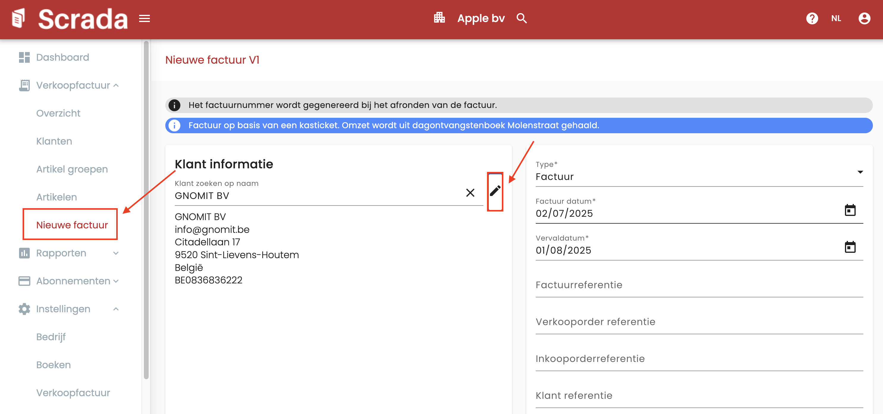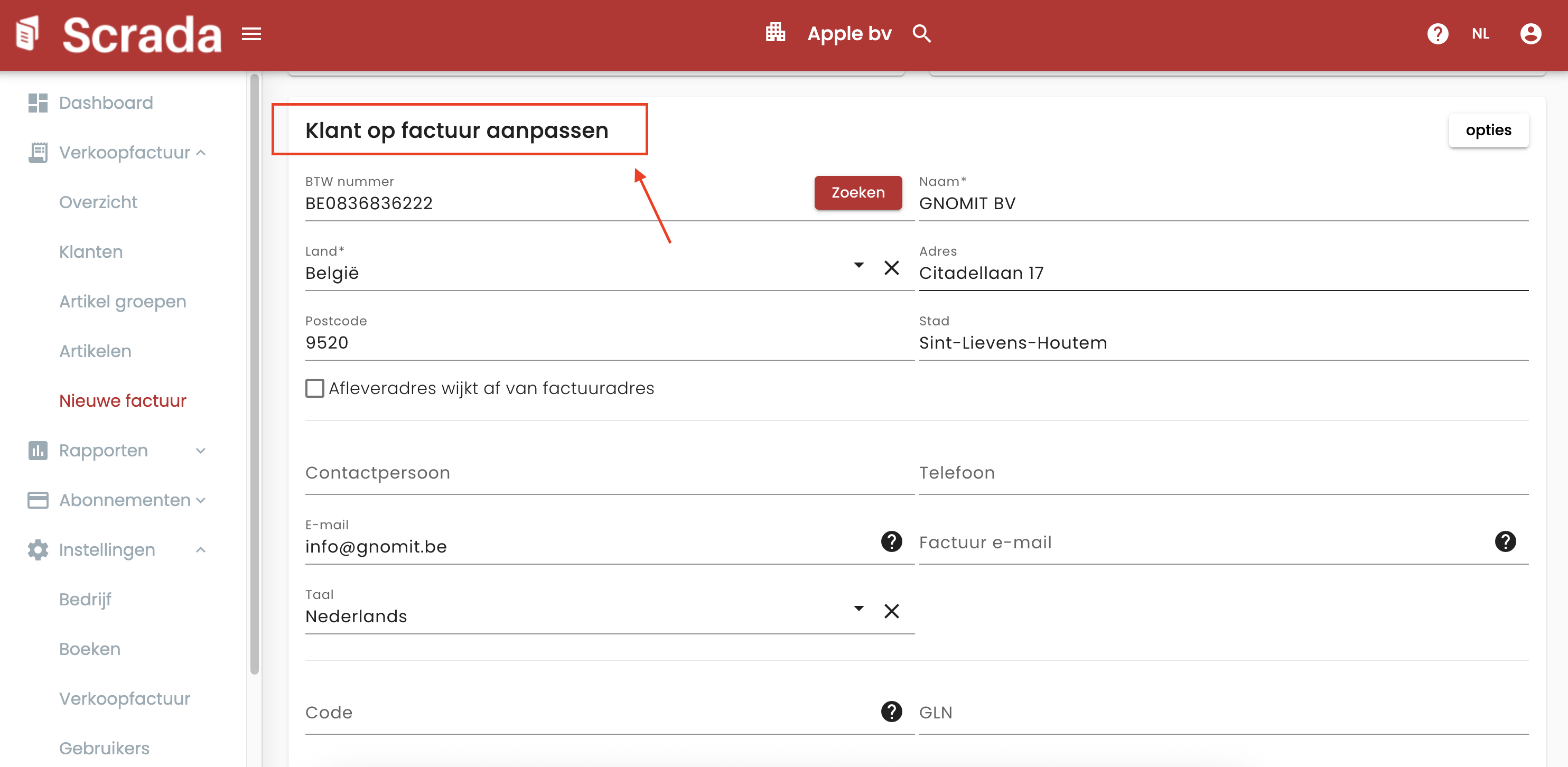 - Onder 'Klant op factuur aanpassen' kunt u de wijzigingen doen