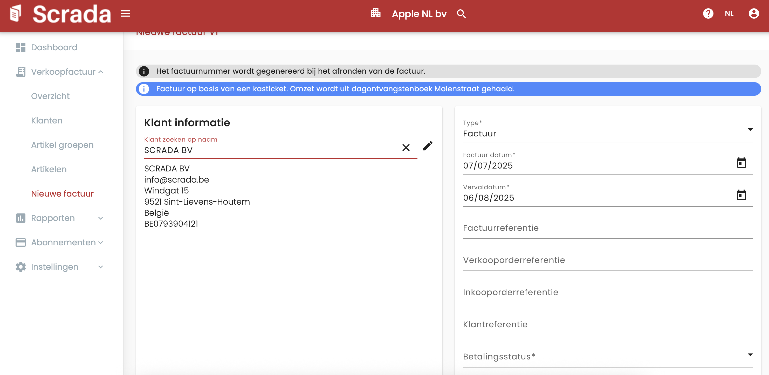 - Hebt u een dagontvangstenboek van Scrada? Dan krijgt u de vraag 'Is de factuur gebaseerd op een kasticket of omzet die al is ingeschreven in het dagontvangstenboek?'.