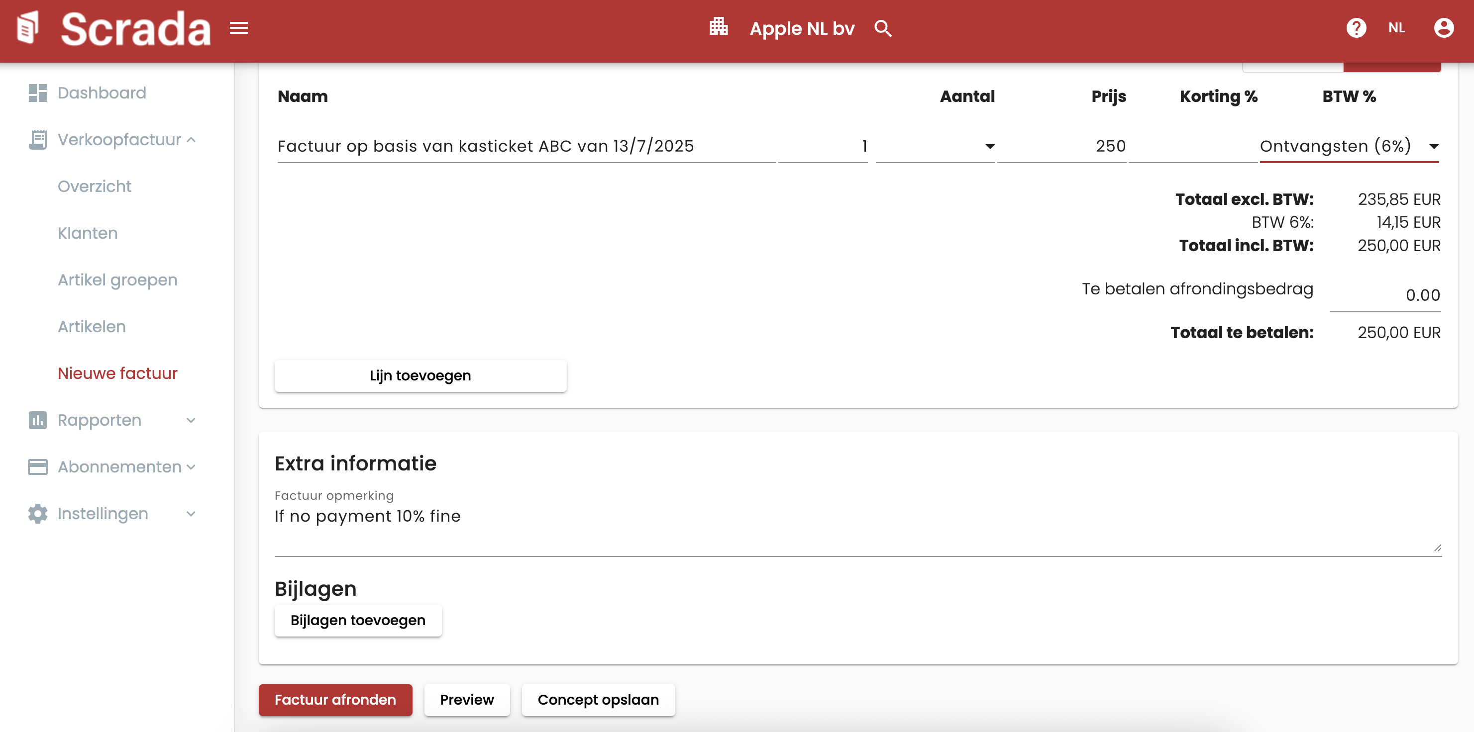Bijvoorbeeld: Factuur op basis van kasticket xxx op datum van 14/07/2025. Vul vervolgens het aantal, de prijs en het btw-percentage in voor die regel. - Vul, indien nodig, extra informatie toe die ook op de factuur vermeld mag worden.