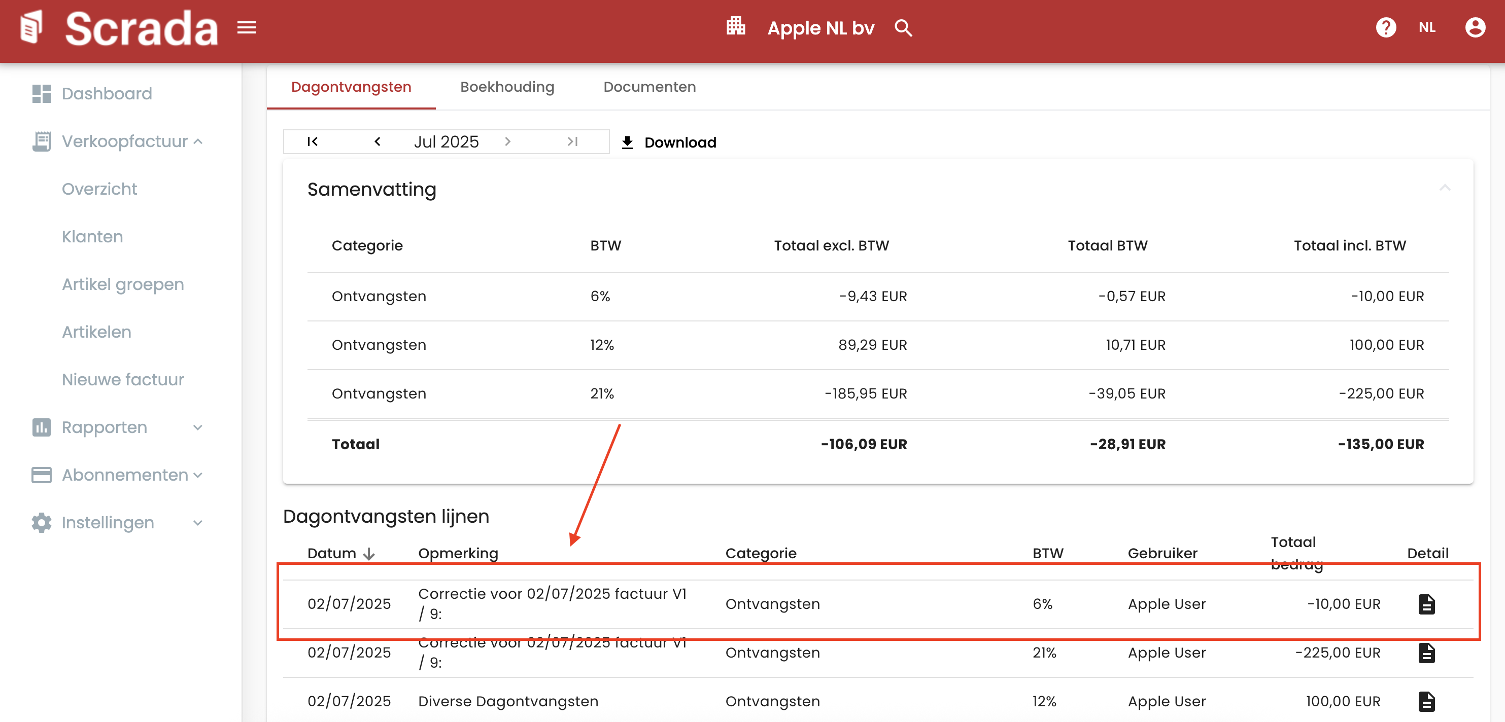 - Ga naar 'Menu/Dashboard' en kies bij het dagontvangstenboek voor 'Historiek'. Daar ziet u dat er een correctie staat ingeschreven van de factuur.