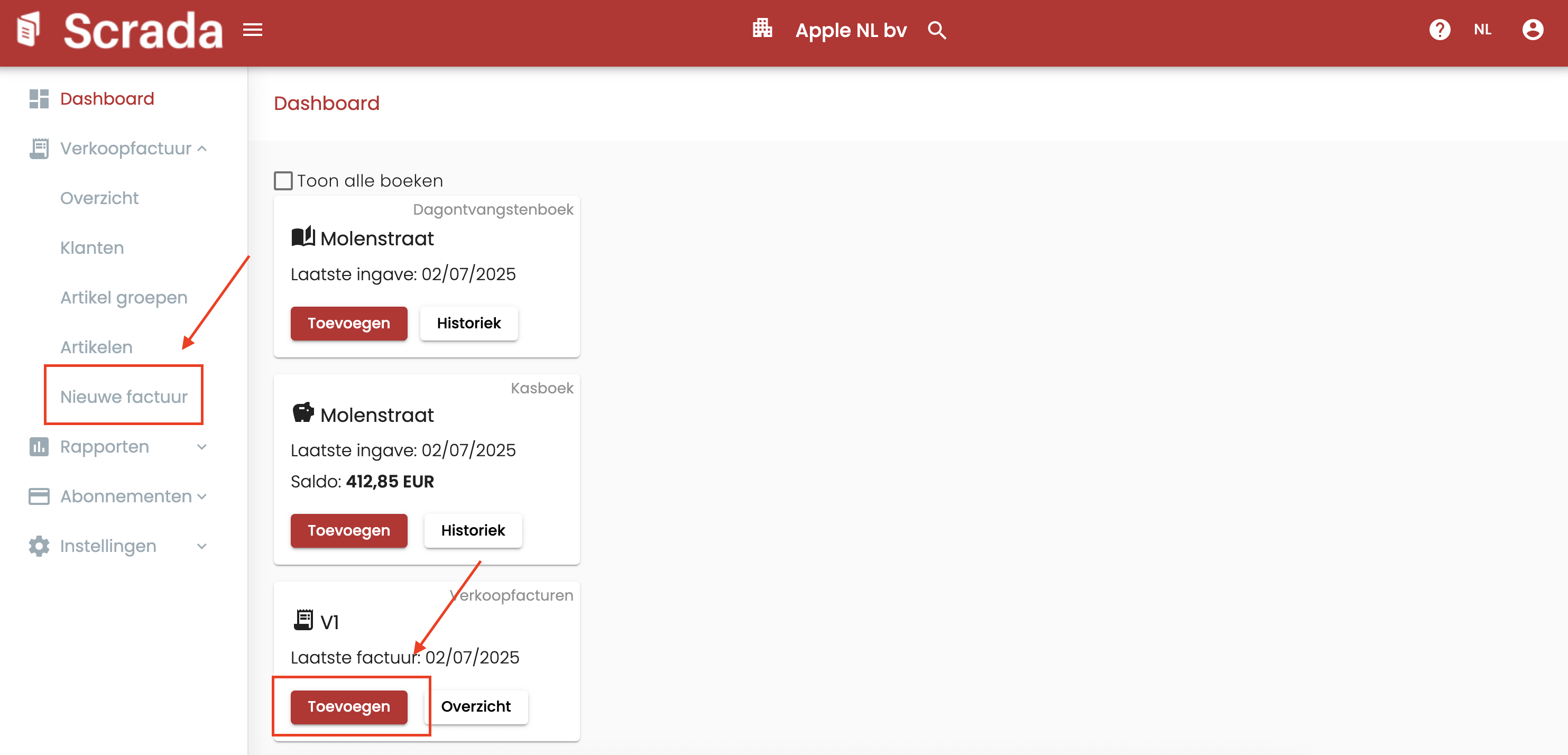 - Ga naar 'Menu/Dashoard': klik op de tegel van het gewenste verkoopdagboek (bijv. V1) op 'Toevoegen'. Dan maakt u een factuur in dat verkoopdagboek. OF