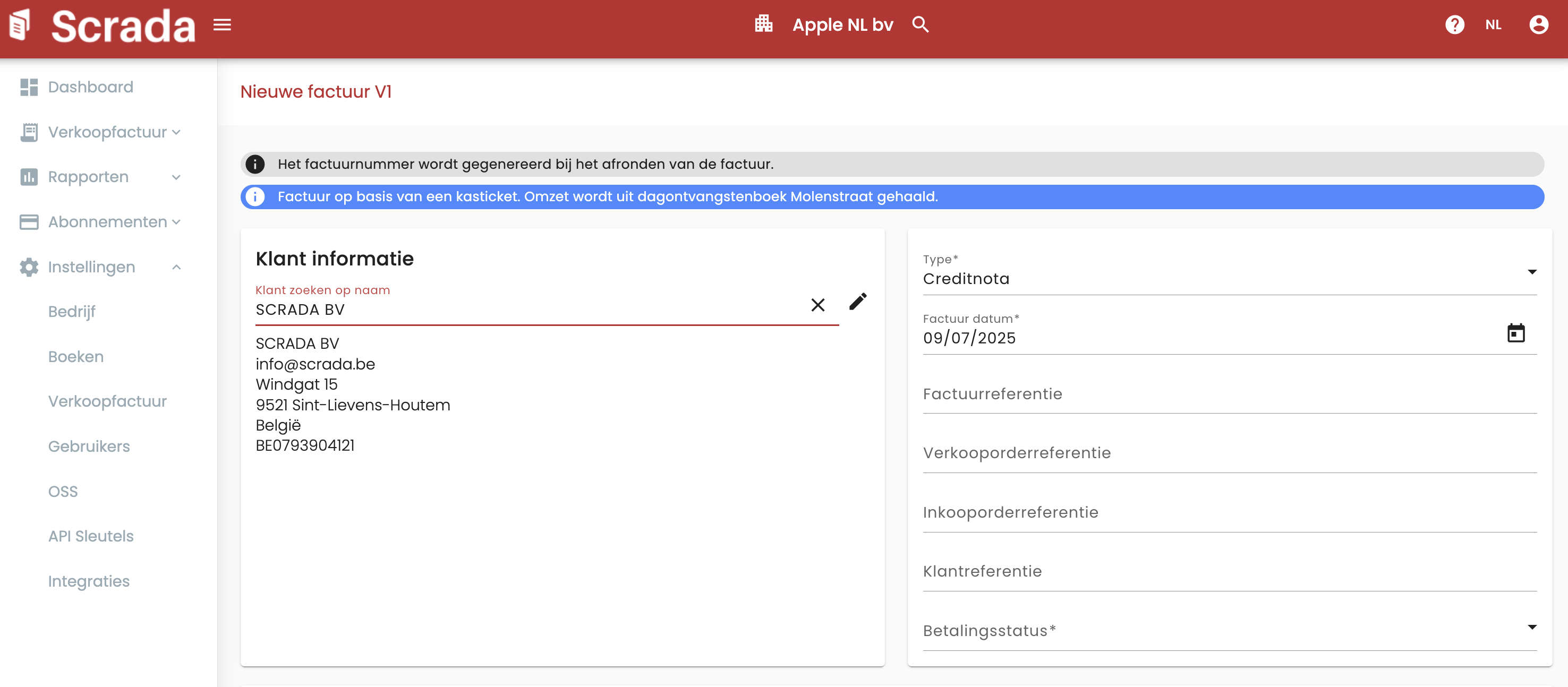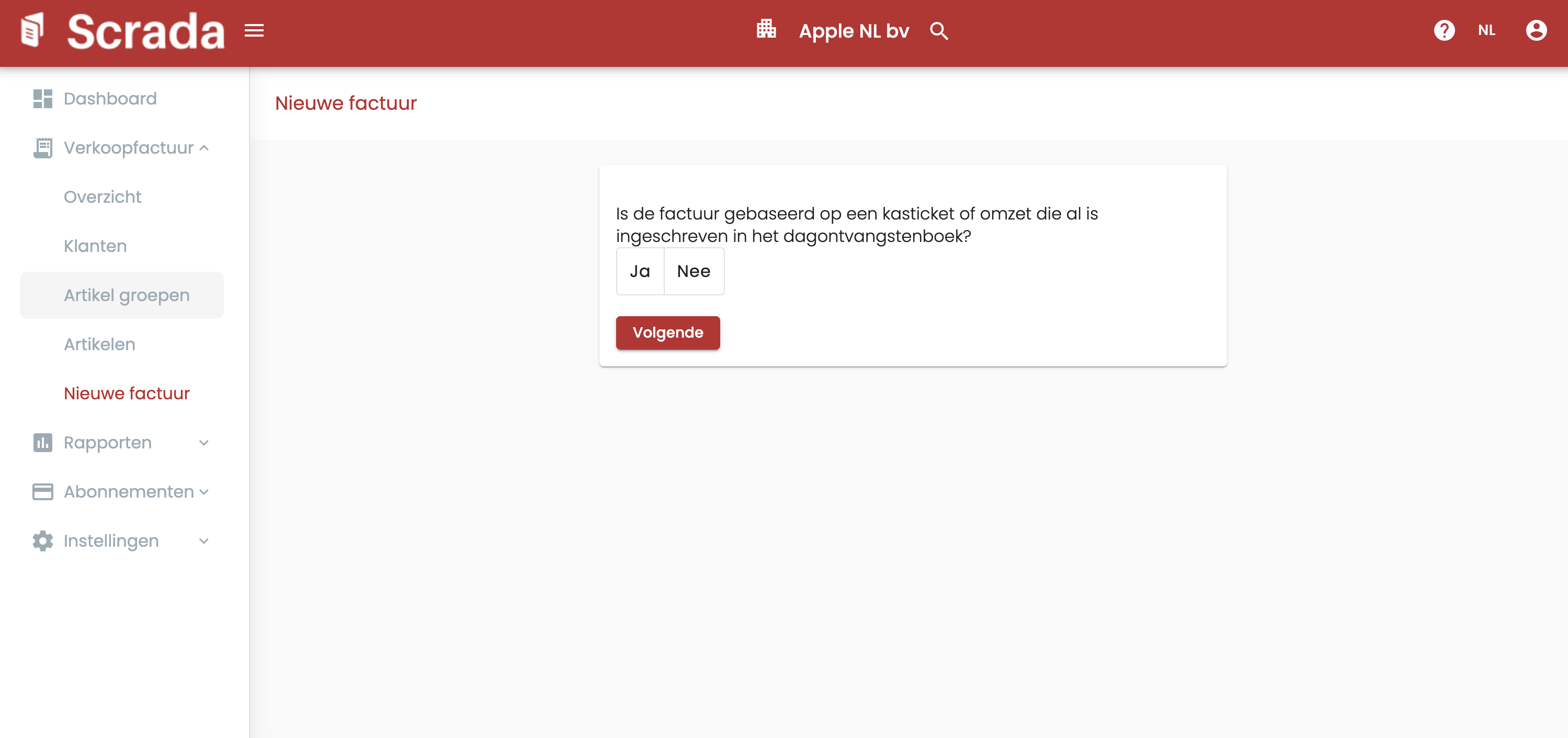 - Hebt u een dagontvangstenboek van Scrada? Dan krijgt u de vraag 'Is de factuur gebaseerd op een kasticket of omzet die al is ingeschreven in het dagontvangstenboek?'.