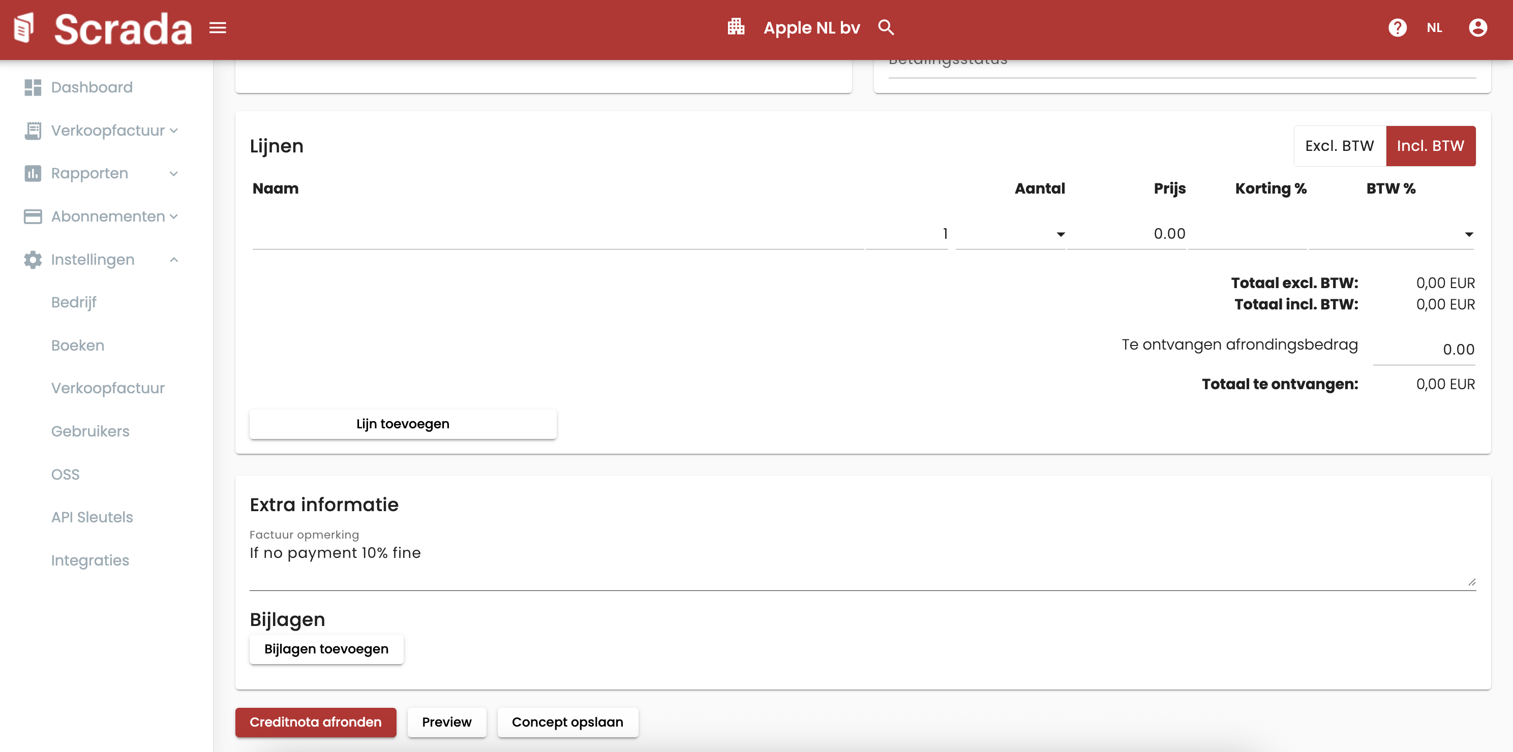 - Pas eventueel de gegevens aan en klik op de knop 'Creditnota afronden'