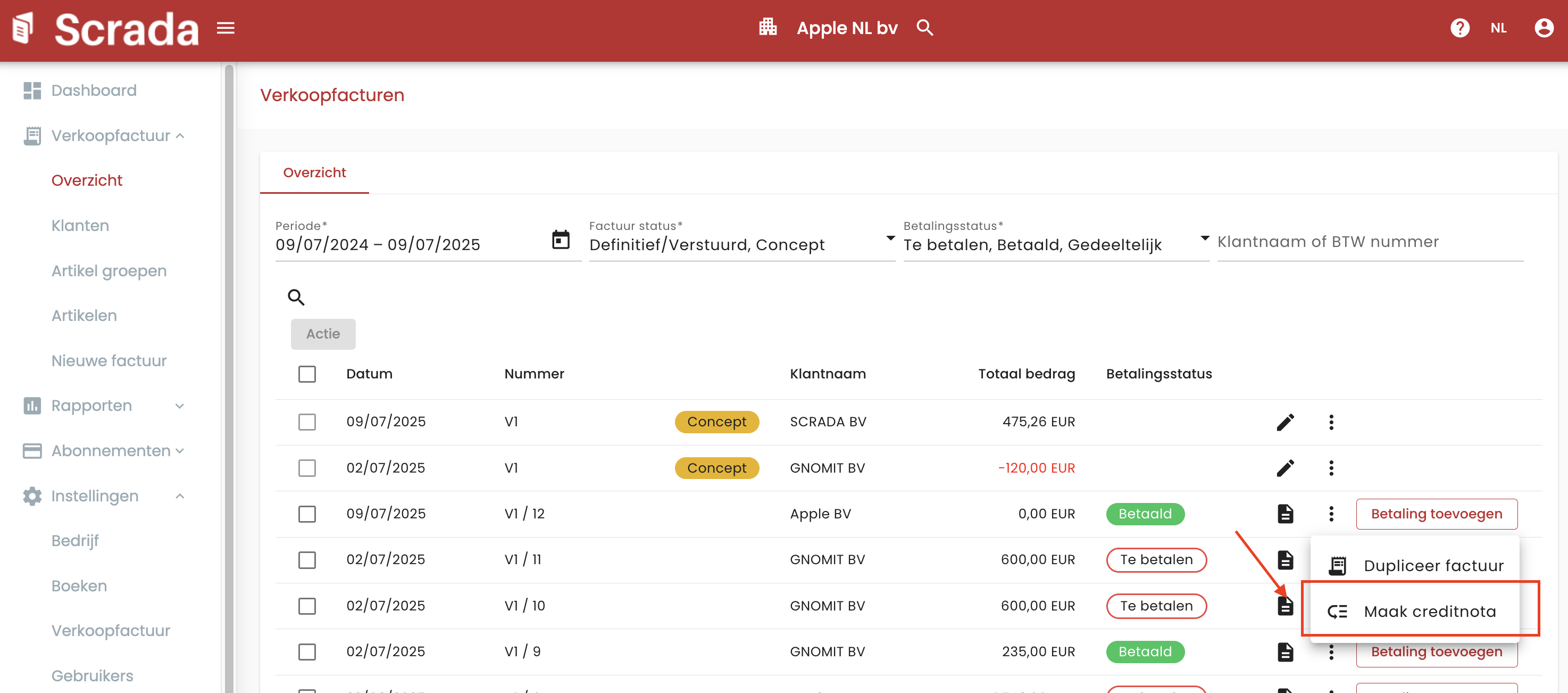- Klik op de drie puntjes naast de factuur waarvan u een creditnota wenst te maken en kies voor 'Maak Creditnota'