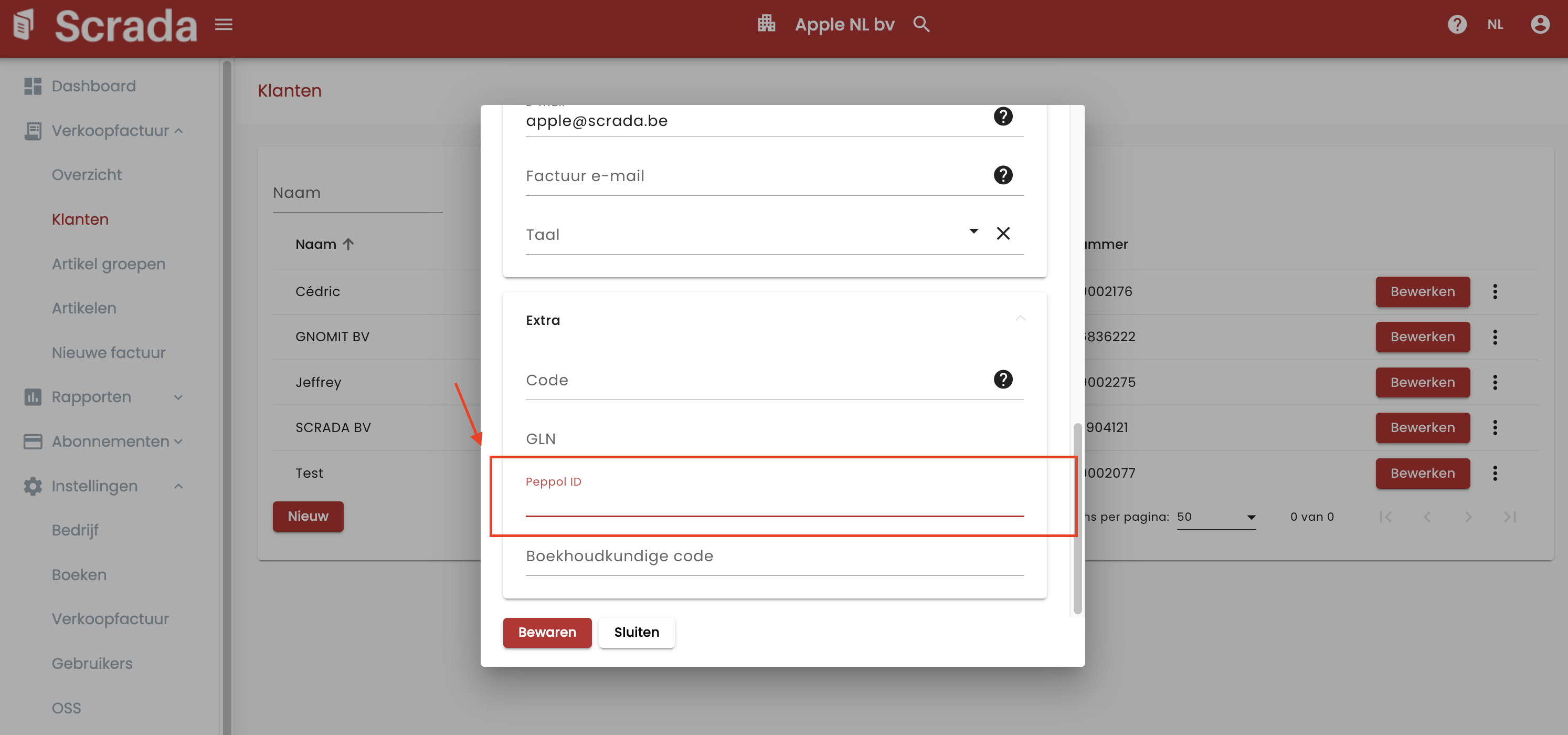 - Klik op de knop 'Bewerken' naast de klant waar u het Peppol ID aan wil toekennen