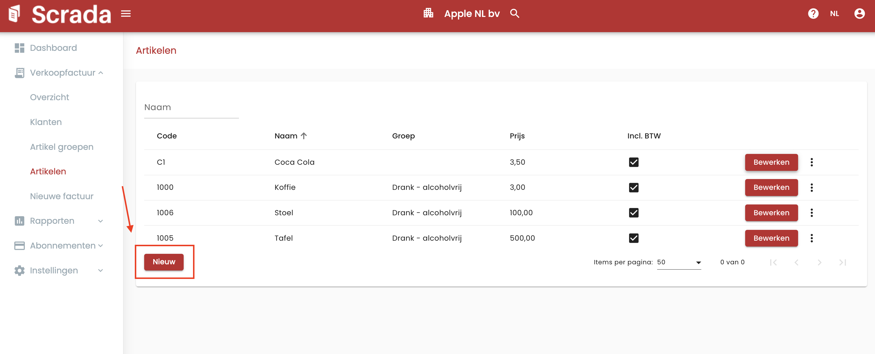 - Ga naar 'Menu>Verkoopfacturen>Artikelen'