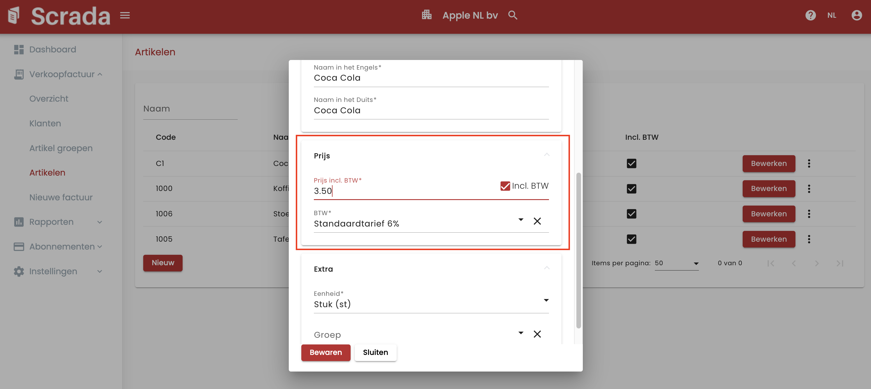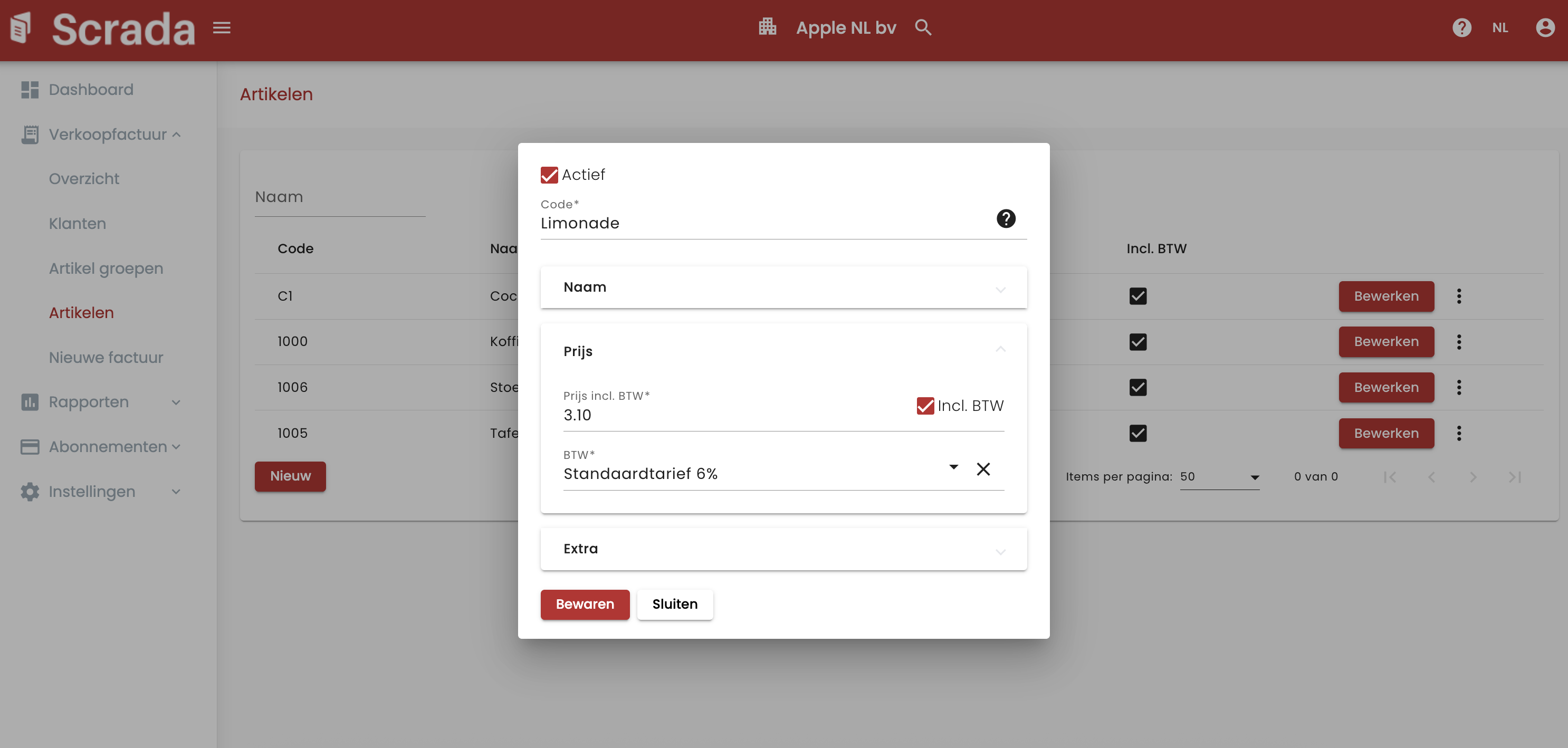 U kunt in Scrada één of meer artikelen aanmaken, met een standaardprijs. Het is echter niet mogelijk om prijslijsten op te laden.
