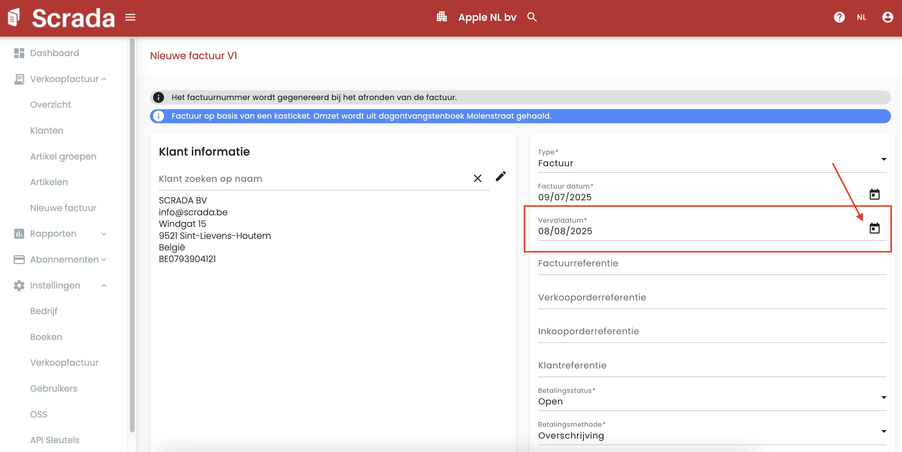 De vervaldatum van de factuur is automatisch ingesteld op 30 dagen. U kunt deze datum aanpassen wanneer u de factuur opmaakt. Volg hiervoor volgende stappen: